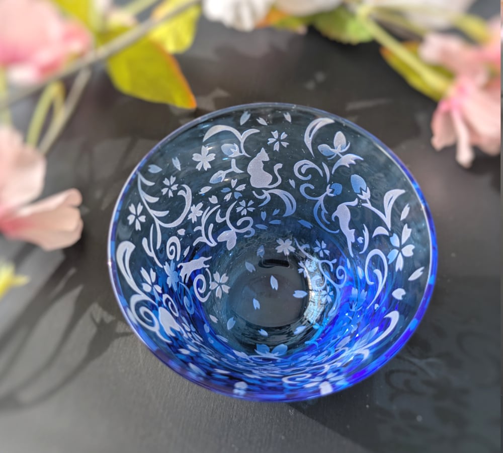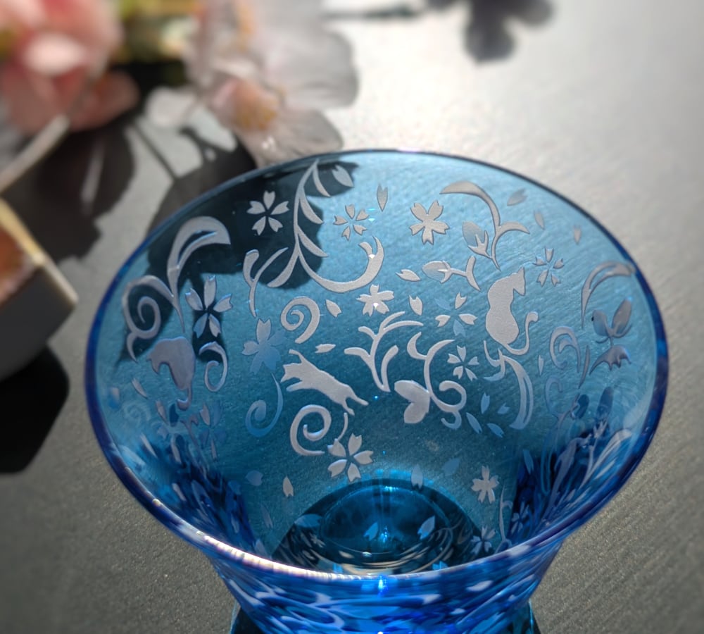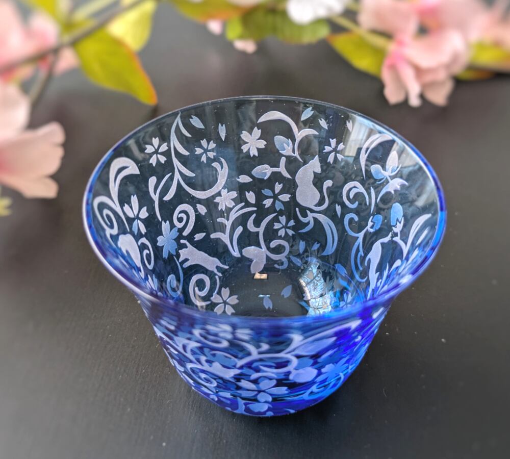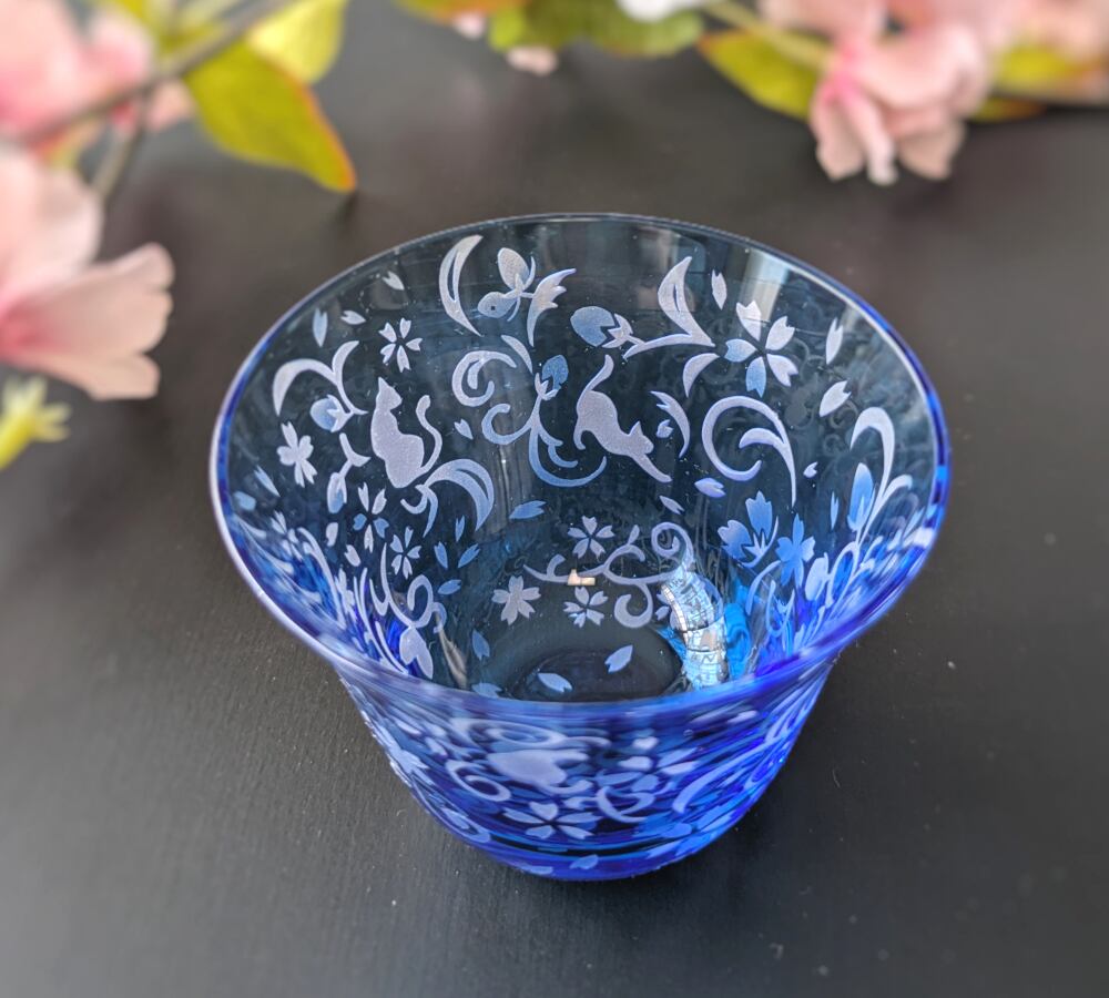 深みのある水色の江戸硝子の中に、華やかな桜花爛漫の様子が広がり、さりげなく随所に猫たちが隠れる、ちょっとシックでワクワク感もあるおちょこです。