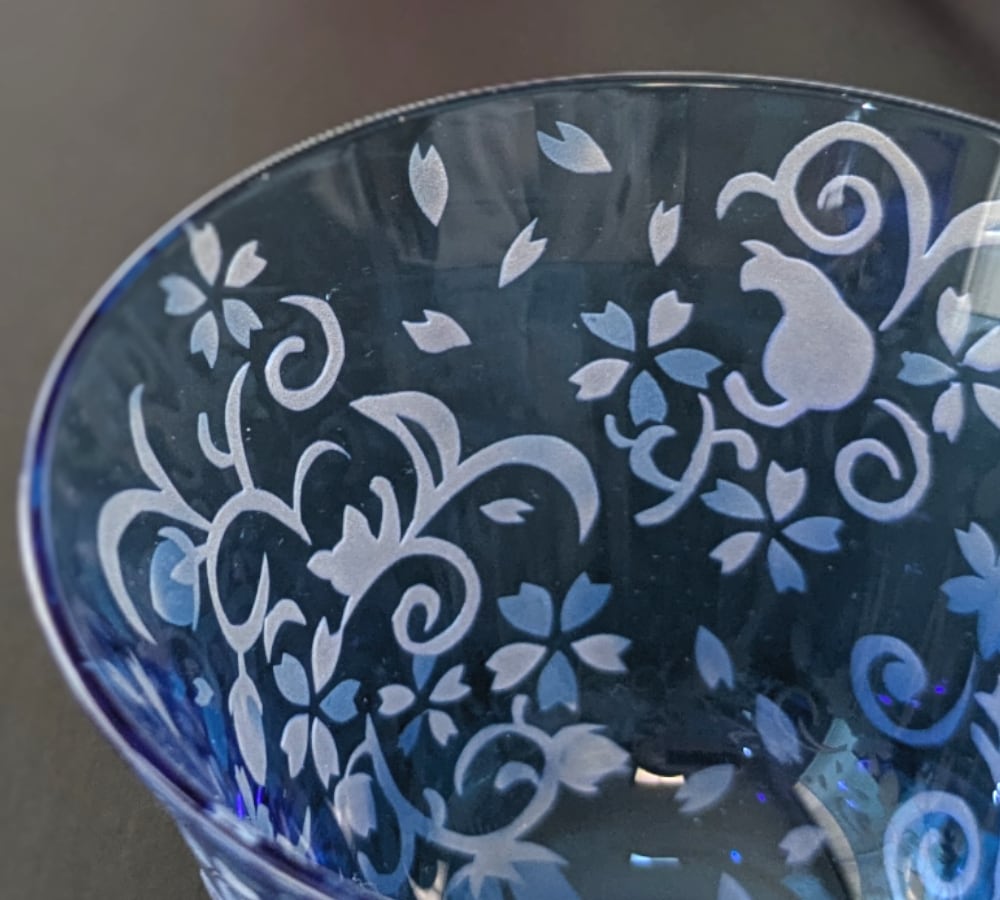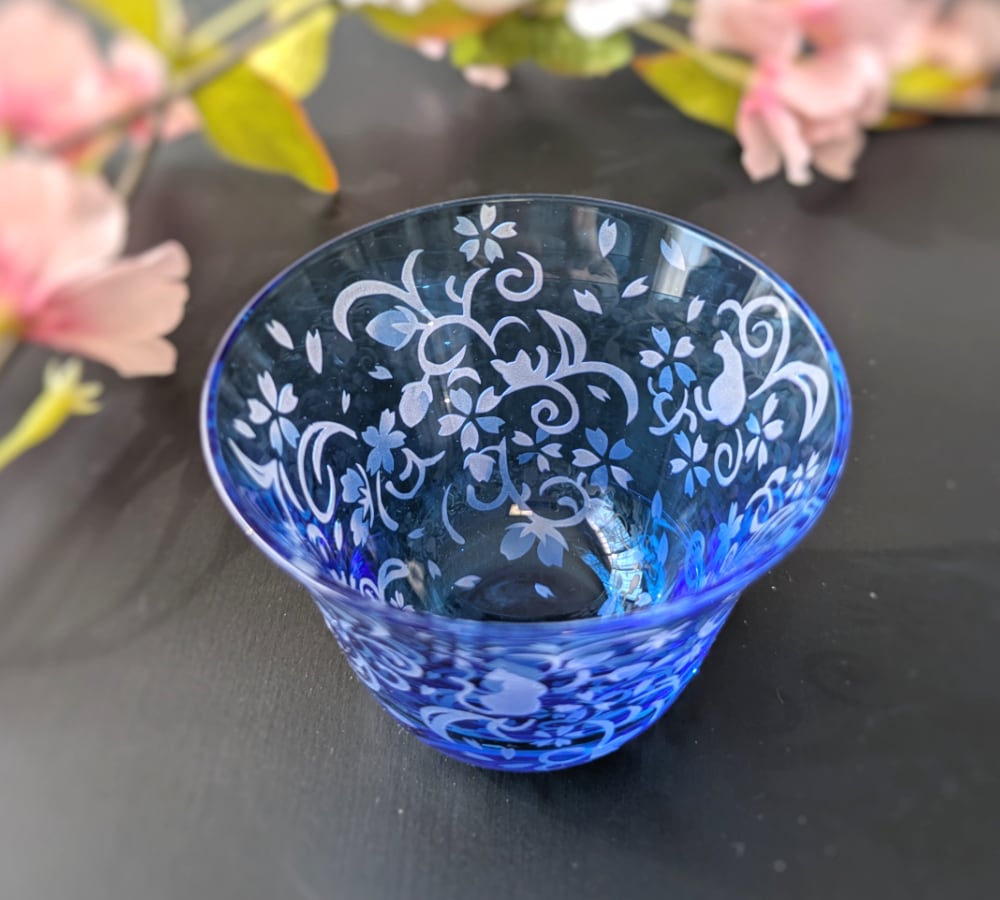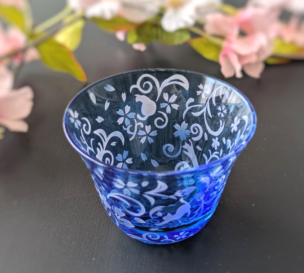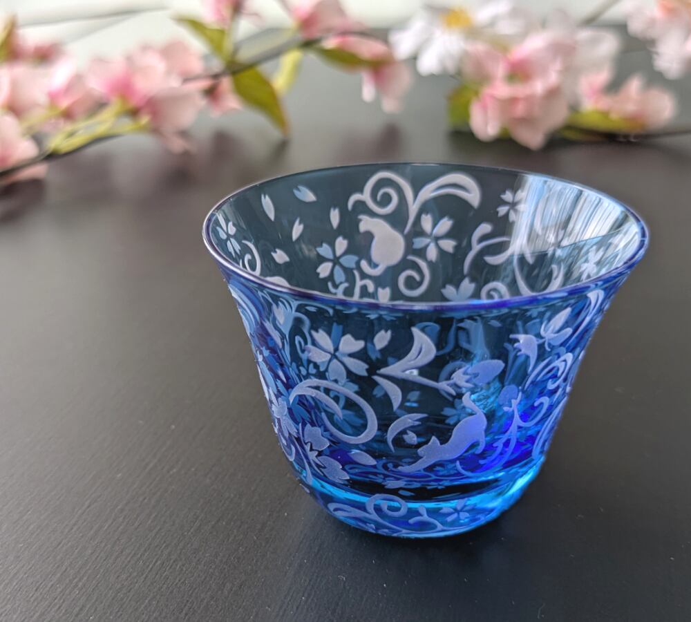 深みのある水色の江戸硝子の中に、華やかな桜花爛漫の様子が広がり、さりげなく随所に猫たちが隠れる、ちょっとシックでワクワク感もあるおちょこです。